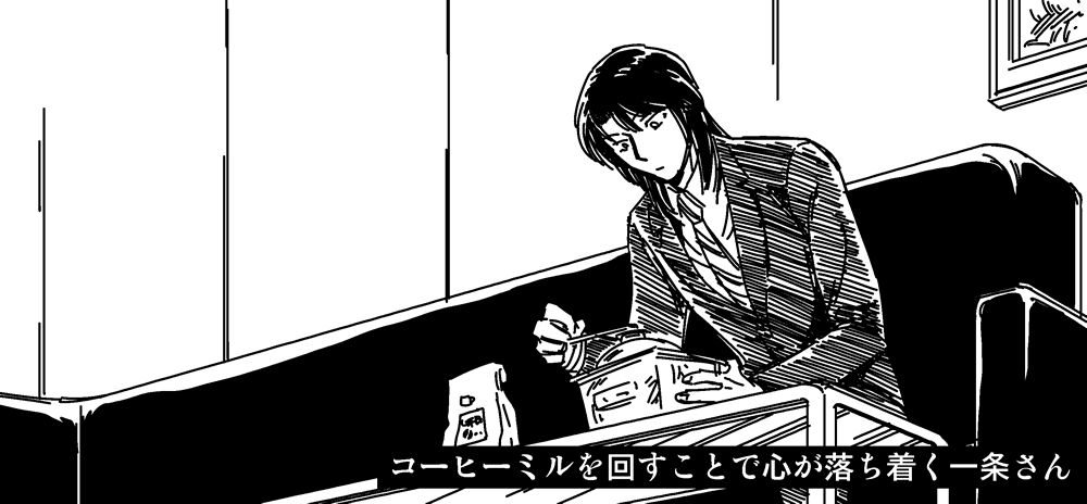 コーヒーミルを回していると心が落ち着く一条さん。