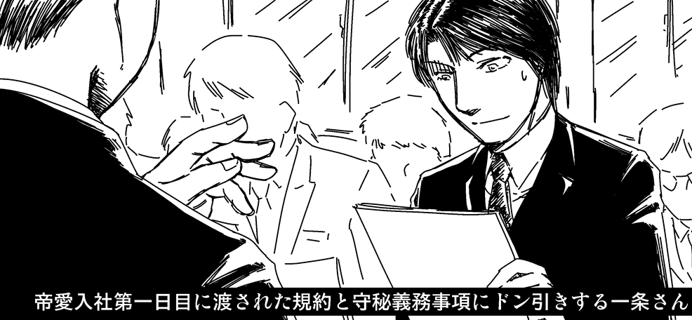 帝愛入社後一日目に渡された各種書類で守秘義務の内容を読み「こんなに守秘事項が多いって一体どういう……」とドン引きする一条さん。